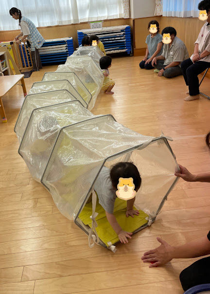 お絵描きコーナーでは、なぐり描きやシール貼りでは「上手だね」と褒めてもらいながら行っていました。ながいトンネルは何度も何度もハイハイでくぐります。おじいちゃんおばあちゃんが見てくれてたから、みんな張り切ってました。一緒にトンネルに入ってくれたおばあちゃんもいました。おままごとコーナーでは、おさらにご飯をのせて、「はいどーぞ」「ありがとう」とかわいいやりとりが見られました。ご自分のお孫さんだけでなく、お友だちみんなと遊んでくれました。