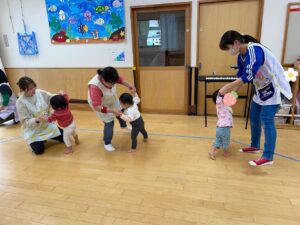 0歳児ひよこ組はわらべ歌「どてかぼちゃ」を先生と一緒にやりました。