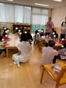 いつも楽しんでいるダンスをを披露した後、お店屋さんごっこの品物をつくりました。「赤色と黄色にする!」と好きな色のシールを選んだり、「上手に貼れてすごいね。」と指先を上手に使って貼れる姿を褒めてもらって嬉しそうでした。「いらっしゃいませ~!」「これください!」と、元気な声が響き渡ったお店屋さんごっこの時間でした。終わりの頃には、自分のおじいちゃんおばあちゃん以外の方とも仲良くなったり、会話を楽しんでいました。