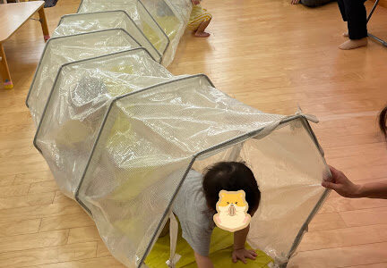 お絵描きコーナーでは、なぐり描きやシール貼りでは「上手だね」と褒めてもらいながら行っていました。ながいトンネルは何度も何度もハイハイでくぐります。おじいちゃんおばあちゃんが見てくれてたから、みんな張り切ってました。一緒にトンネルに入ってくれたおばあちゃんもいました。おままごとコーナーでは、おさらにご飯をのせて、「はいどーぞ」「ありがとう」とかわいいやりとりが見られました。ご自分のお孫さんだけでなく、お友だちみんなと遊んでくれました。